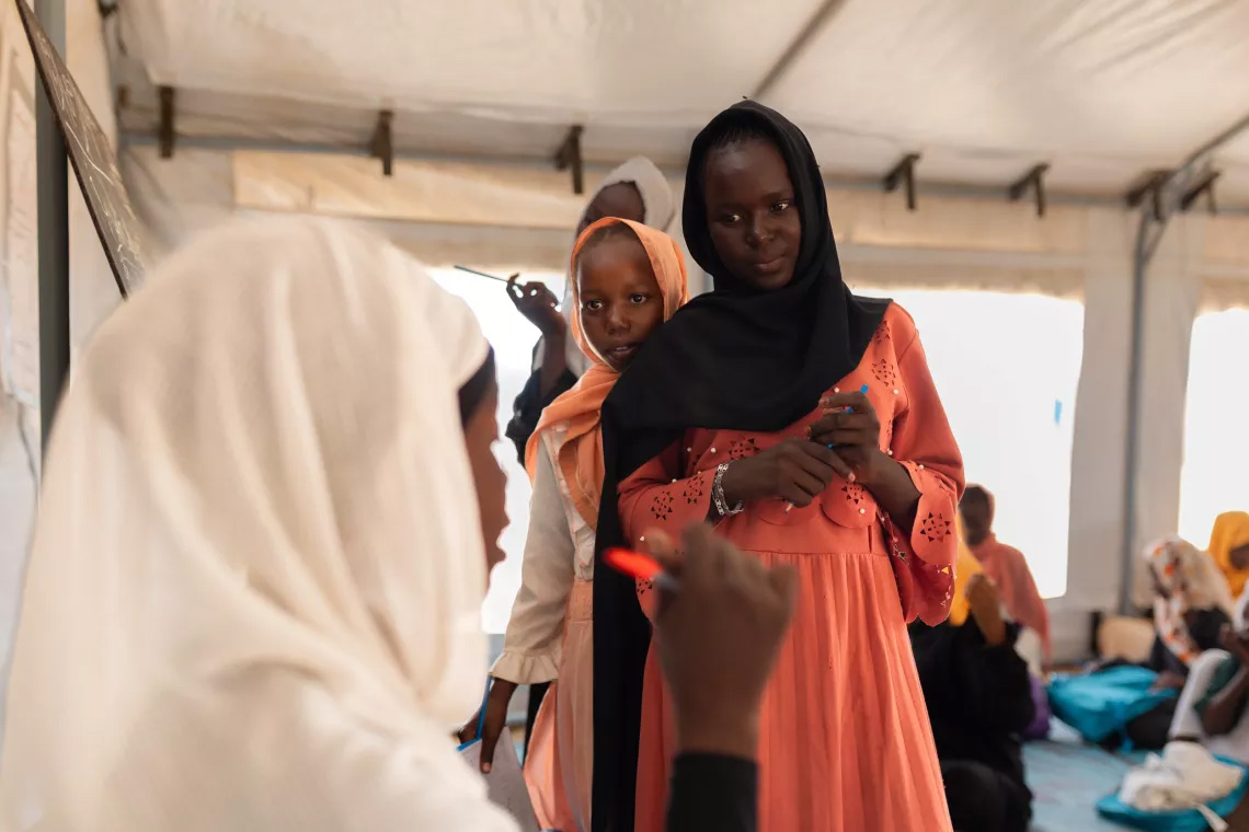 During a morning lesson, she sits at the front of the class in a UNICEF tent that serves as a temporary learning space for the displaced children. She listens carefully, jots down notes, and consults her peers on anything unclear after the lesson. Her new friends - Suhad and Rahel- have been instrumental in her learning journey and continue with her every step of the way.Â